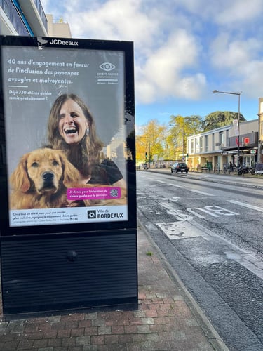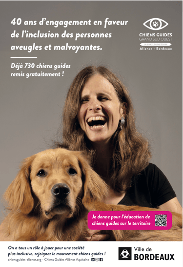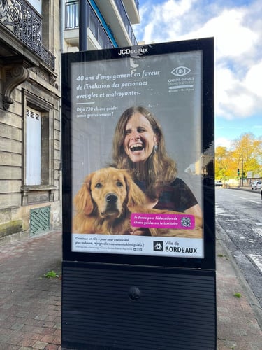 Si vous vous êtes baladés dans les rues de Bordeaux en octobre 2025, vous êtes peut-être tombés par hasard sur cette affiche mettant en scène Marion et Texas. J’ai eu la chance de concevoir cette campagne aux côtés des Chiens Guides Aliénor à l’occasion de leur 40ᵉ anniversaire.
